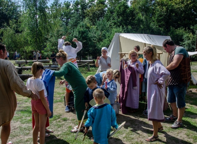 Dla najmłodszych przygotowaliśmy „Strefę małego woja”. Można było tam zagrać w grę związaną z wystawą „Kajko i Kokosz. Komiksowa Archeologia”, która jest do zobaczenia w naszym pawilonie muzealnym. Proponowaliśmy Wam również warsztaty plastyczne – można było pokolorować obrazki z przeszłości lub stworzyć własny obraz od zera. Czekała również przebieralnia, gdzie można było zamienić się w mieszkańca wioski, oraz liczne gry i zabawy. Niedaleko niej czekały warsztaty z wykonywania motanek, czyli prostych laleczek.