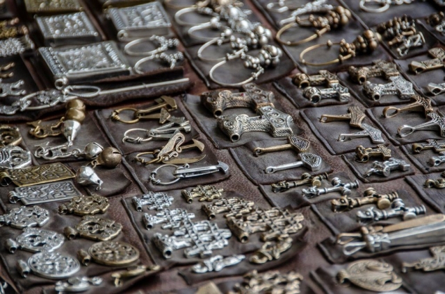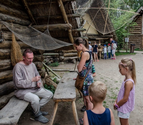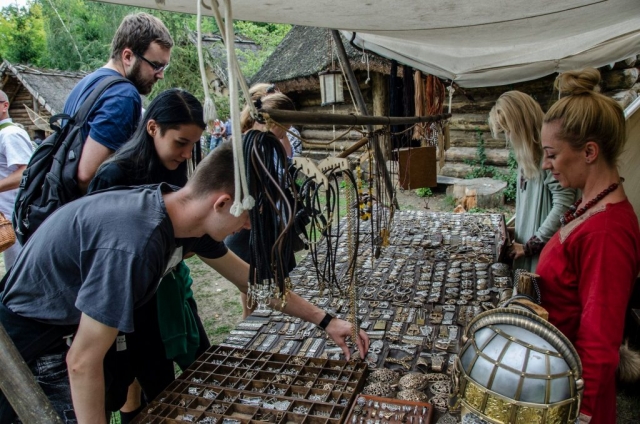 Tkaczki, prządki, farbiarki – u nich mogliście dowiedzieć się, jak powstawały stroje we wczesnym średniowieczu. Wielu z Was było zadziwionych ogromem pracy, który był niezbędny do stworzenia najprostszej nawet koszuli. Równie liczna była grupa adeptów garncarstwa. Mogliście ulepić naczynie z gliny, z czego liczne grono skorzystało, wracając do domu z własnoręcznie ulepionym kubkiem lub garnuszkiem. Na szczęście nikt nie zaplątał się w rybackie sieci. A było ich z każdą chwilą coraz więcej, gdyż rybak szył je na waszych oczach. A z czego robiono grzebienie? Z kości? A może z drewna? A igły? A łyżki? U snycerza i rogownika mogliście podziwiać, jak powstawały przedmioty codziennego użytku. W młodym państwie księcia Mieszka zupełnie powszechne nie były na pewno srebrne monety. Lecz również ich sekrety mogliście poznać, zaglądając do warsztatu mincerza. Można tam było również samodzielnie wybić wczesnośredniowieczny pieniądz. A skoro już przy pieniądzach jesteśmy… W tym czasie, pod rządami Mieszka, panowie nie szczędzili go na ozdoby dla swoich kobiet. Wędrowny jubiler przybył na nasze wydarzenie specjalnie po to, by pokazać, jak wyglądała biżuteria z tamtych czasów. Gdy ktoś zgłodniał, zapraszaliśmy do naszej kuchni. A wszystko to rozgrywało się przy dźwiękach replik wczesnośredniowiecznych instrumentów muzycznych.